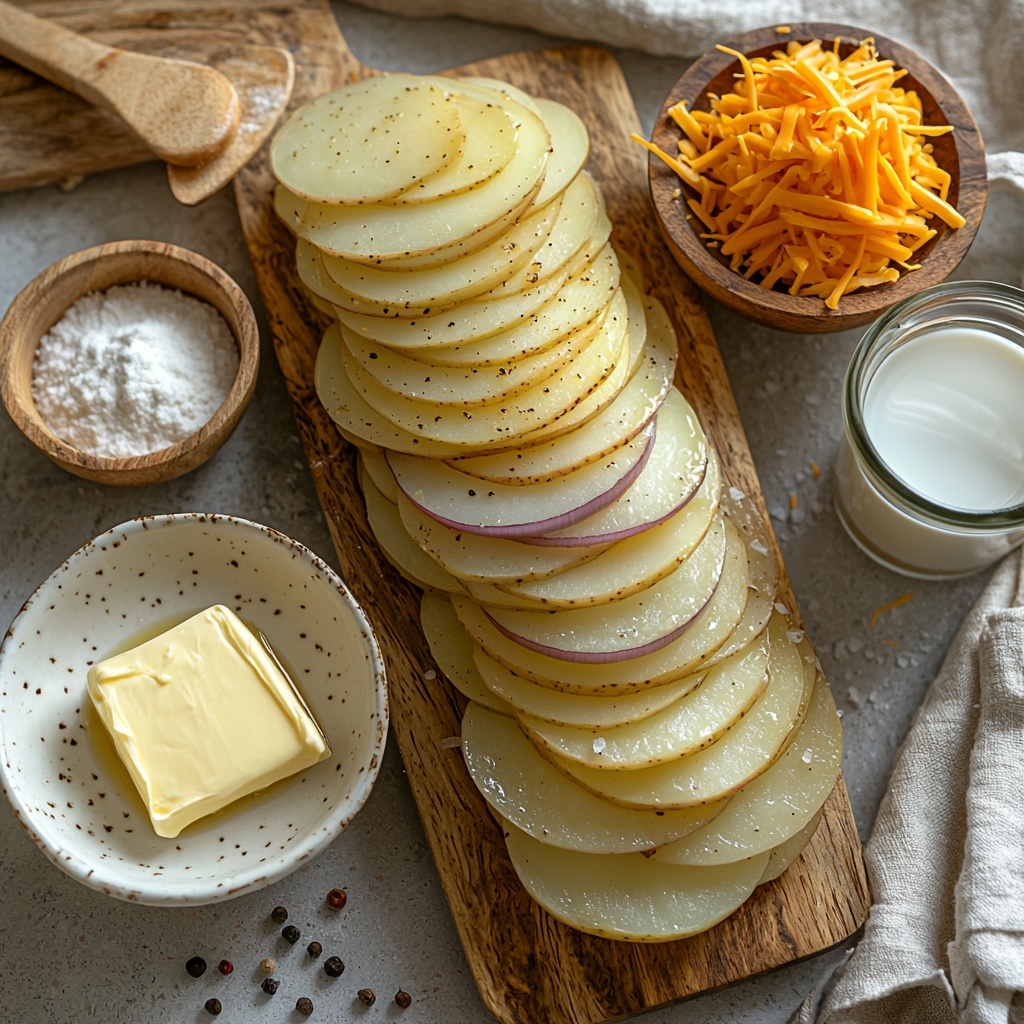 These ingredients are straightforward yet incredibly important in creating that perfect harmony of flavors and textures in your Potatoes au Gratin Recipe. Each component plays a key role in delivering creaminess, cheesiness, and that beautiful golden top you’ll instantly admire.