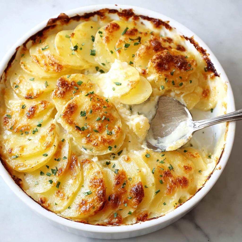 Pour the dreamy cheese sauce evenly over the layered potatoes and onions. Cover the dish tightly with foil to trap the steam and bake for 50 to 60 minutes, allowing the potatoes to become tender and soak up the sauce. After this, remove the foil and bake uncovered for another 15 to 20 minutes until the top turns irresistibly golden and bubbling—this final step adds that classic gratin crunch and color.