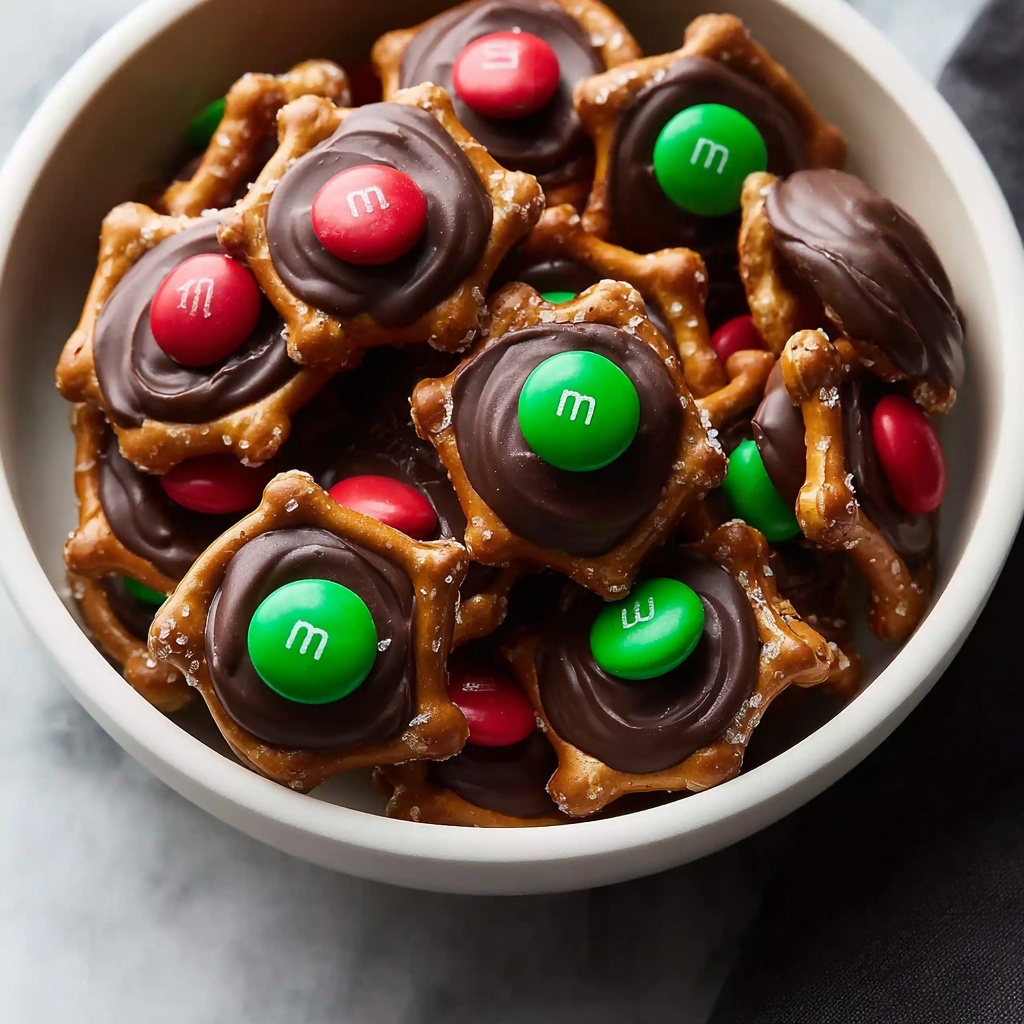 These Pretzel Rolo M&M bites combine salty and sweet flavors in a crunchy, bite-sized treat. Mini pretzels are brushed with butter and baked with softening Rolos, topped with colorful M&Ms, toasted pecans, and a sprinkle of sea salt. Finished with a delicate white chocolate drizzle, these snacks are perfect for parties, holidays, or anytime you want a delightful sweet and salty bite.