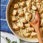 Reheat gently on the stovetop over low-medium heat, stirring occasionally to prevent sticking or curdling. If the gravy is too thick, add a splash of chicken broth or water to loosen the sauce. Avoid microwaving to preserve the creamy texture.