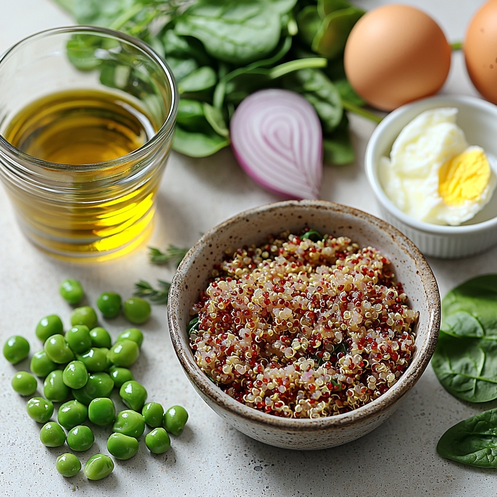 While your quinoa is cooking, heat the olive oil in a pan over medium heat. Add the finely diced red onion and crushed garlic, frying them until they release their tantalizing aroma. Toss in the frozen peas and cook until they soften, then gently mash them to break them up a bit for a smoother texture. Stir in the chopped spinach and fresh thyme leaves, then remove the pan from the heat to keep the vibrant colors bright.