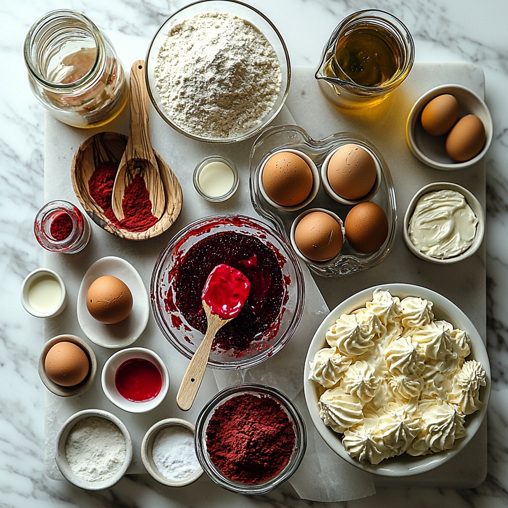 Every ingredient in this Red Velvet Cake with Cream Cheese Frosting Recipe plays a vital role, coming together simply yet perfectly to create that iconic taste and texture. From the flour and cocoa powder that build the cake’s tender crumb to the butter and cream cheese that give the frosting its creamy richness, each element is essential and easy to find.