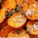 This recipe features tender roasted sweet potatoes infused with the savory flavors of garlic, Parmesan cheese, and Italian seasoning. Perfect as a flavorful side dish, these sweet potatoes are coated in a rich blend of olive oil and melted butter, then roasted to golden perfection and garnished with fresh thyme for a fragrant finish.