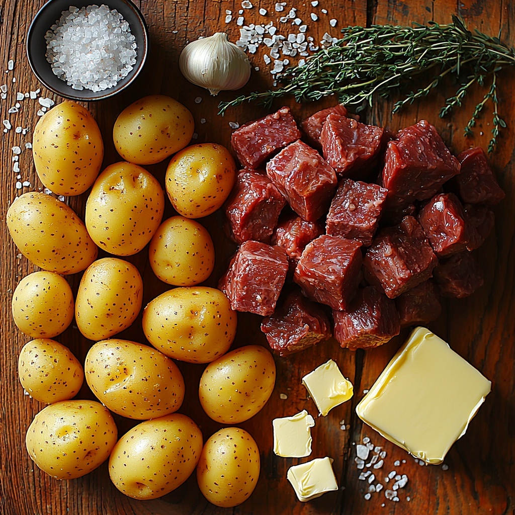 Tender beef stew meat and baby Yukon gold potatoes slow-cooked in a rich garlic butter sauce, seasoned with onion and garlic powder for a comforting, hearty meal perfect for any day.