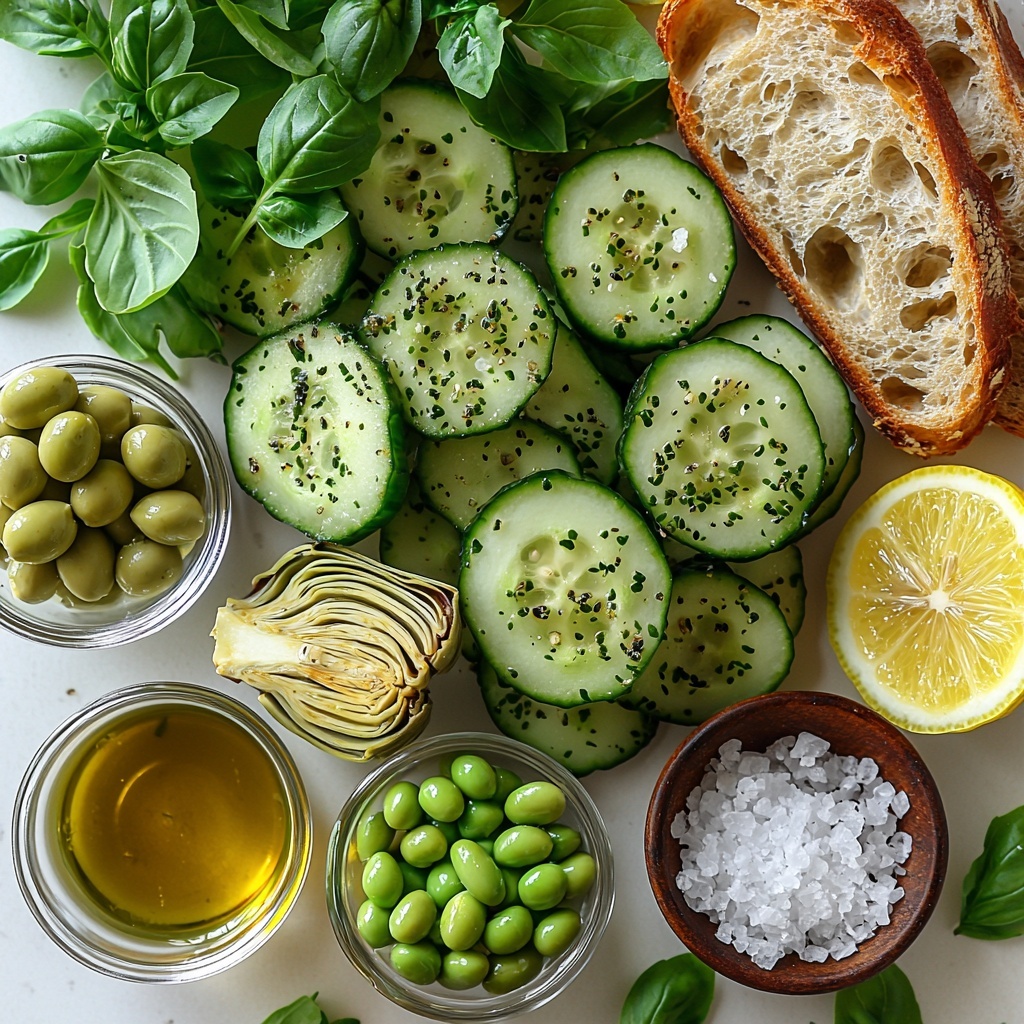 A refreshing and vibrant smashed cucumber toast topped with a creamy artichoke edamame spread, perfect for a light snack or appetizer. This recipe combines crisp cucumbers, flavorful olives, fresh herbs, and a tangy lemon-garlic dressing, served on toasted sourdough bread for a delightful blend of textures and tastes.