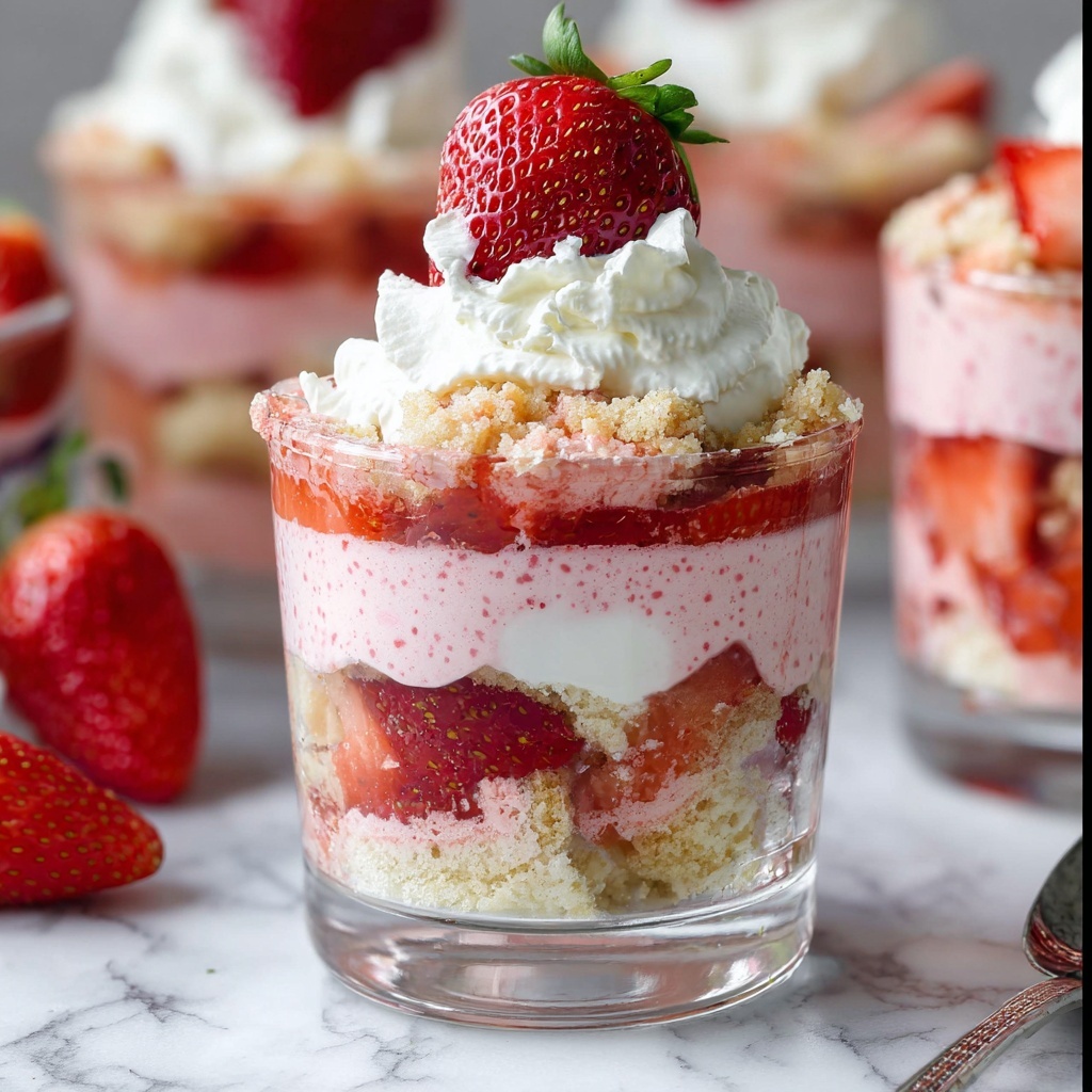 - Layer Ingredients: In serving cups, layer cubed pound cake, followed by strawberries with their juices, then a layer of whipped cream.