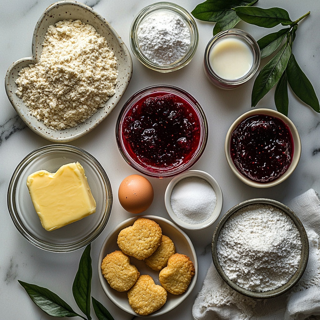 Gathering simple, quality ingredients is the secret behind the magic of this Thumbprint Heart Cookies Recipe. Each component plays an essential role, from the richness of the butter to the sweet tartness of the raspberry jam, creating an irresistible harmony of flavors and textures.