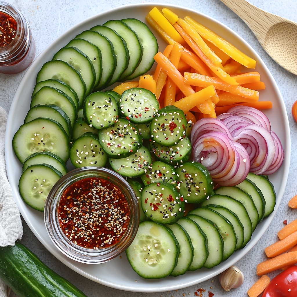 This Viral Cucumber Pepper Salad is a refreshing and vibrant mix of Persian cucumbers, sweet mini bell peppers, and crunchy carrots, tossed in a flavorful Asian miso ginger dressing with a spicy kick from chili crunch oil and everything bagel seasoning. Perfect for a quick, healthy, and colorful side dish or snack.