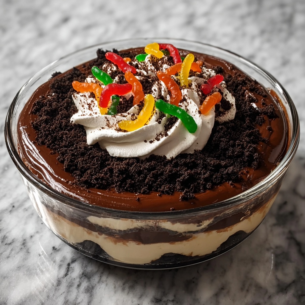 Worms in Dirt is a fun and easy no-bake dessert featuring layers of creamy chocolate pudding, crushed chocolate cookies mimicking dirt, fluffy whipped cream, and colorful gummy worms for a playful touch. Perfect for kids’ parties or themed events, this dessert combines simple ingredients into a whimsical treat that requires no baking and minimal prep time.