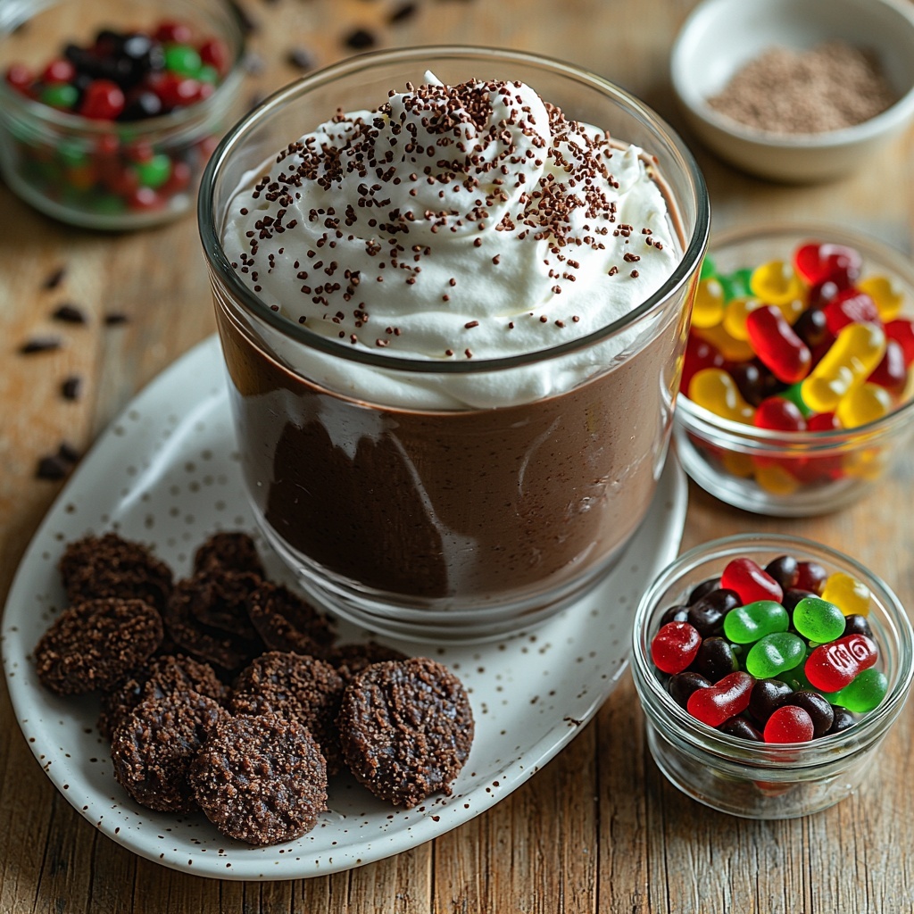 Finish off the dessert by sprinkling chocolate sprinkles over the whipped cream and gummy worms. This step gives the dessert a bit of sparkle and extra chocolate flavor that ties everything together.